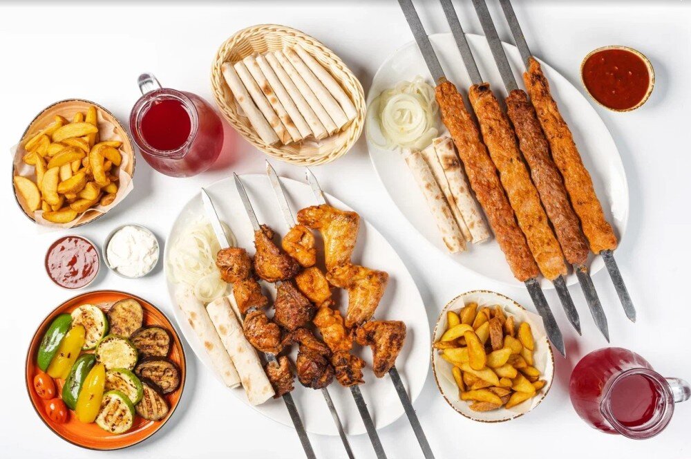 ассорти шашлыков, ассорти люля, овощи-гриль (2 шт.), айдахо (2 шт.), лаваш (2 шт.), морс брусничный (2 л)