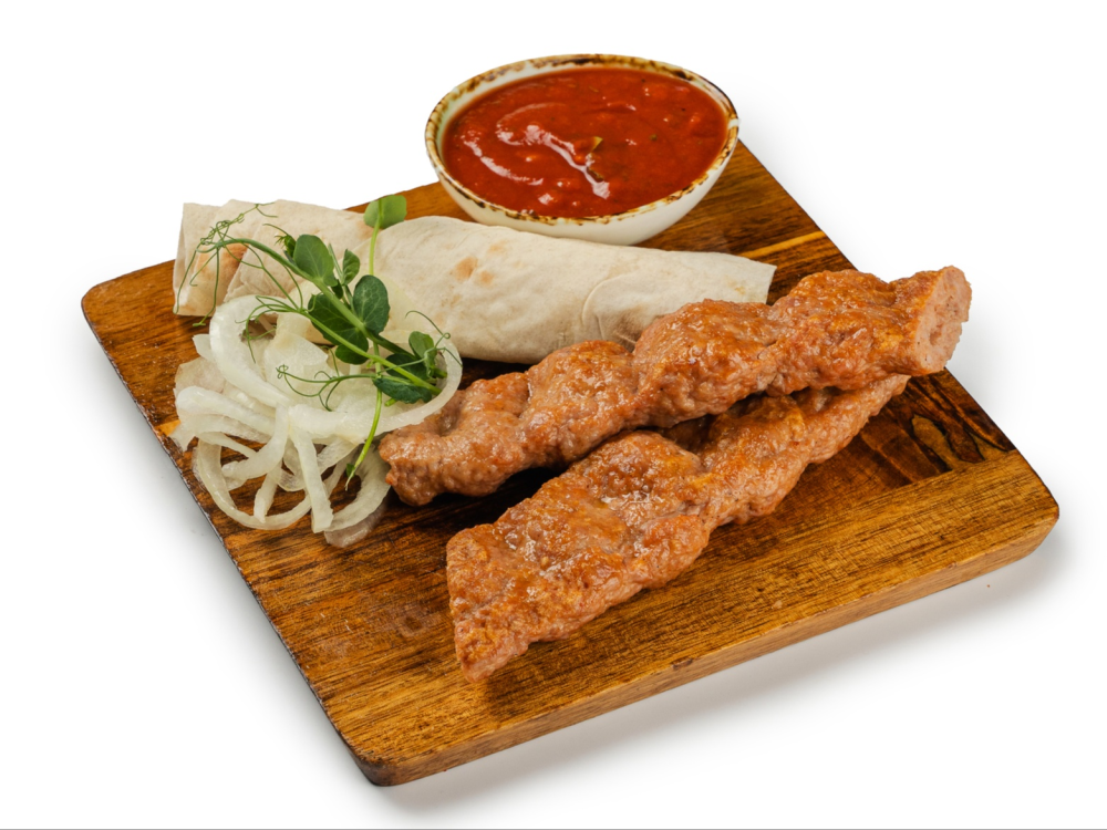 Люля-кебаб из курицы, обжаренный на мангале до золотистой корочки, подаётся с тонким лавашом, с ароматным томатным соусом и свежими ломтиками лука, создавая сытное и аппетитное блюдо.