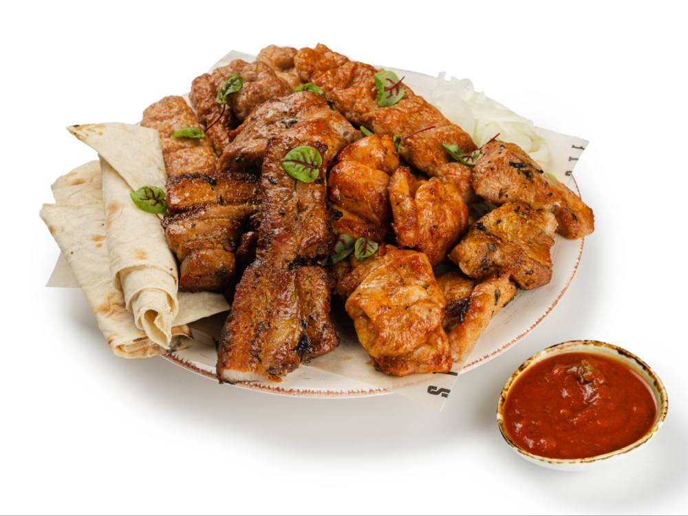 Большой набор мясных деликатесов для компании: Сочные шашлыки из курицы и свинины, Хрустящие свиные рёбра, Ароматные люля-кебаб из свинины, говядины и курицы, Свежий лаваш, Лук, Томатный соус. Идеально для компании до 5ти человек!