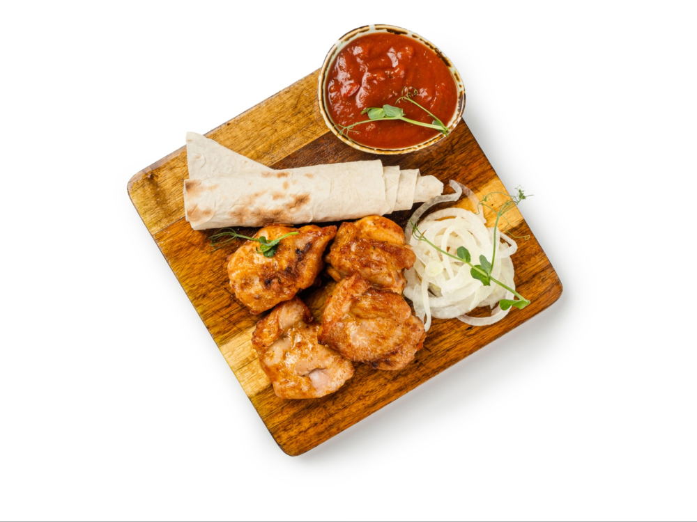 Аппетитный куриный шашлык в сопровождении пряного томатного соуса и маринованного лука, подается с тонким лавашом, даря незабываемые вкусовые ощущения.